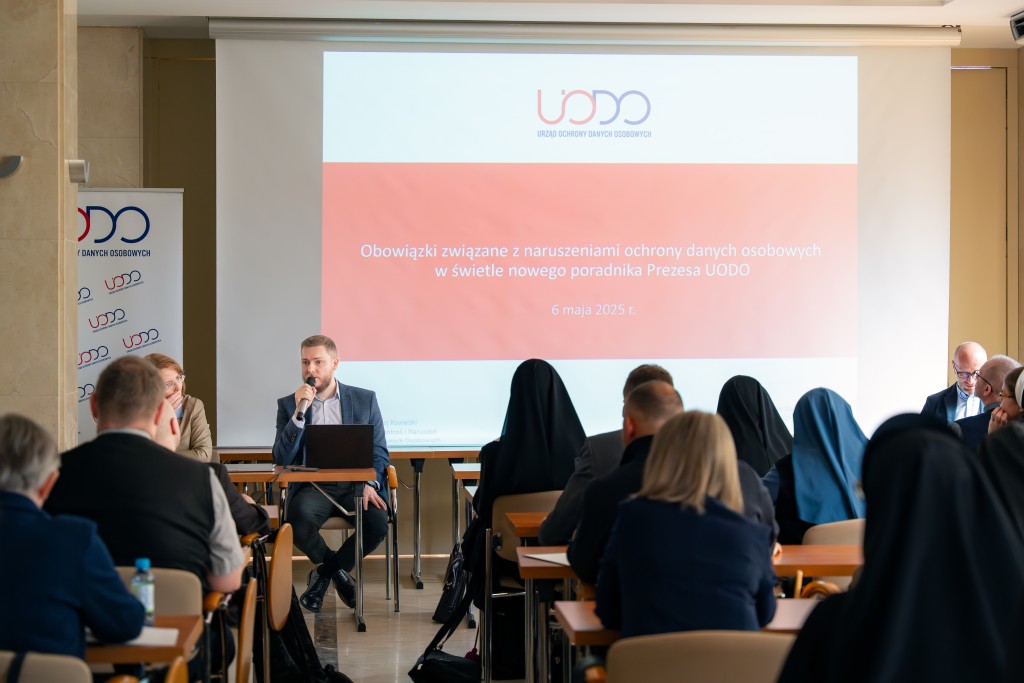 Szkolenie zostało podzielone na dwie części. W pierwszej pracownicy UODO przedstawili najnowszy poradnik Urzędu dotyczący zgłaszania naruszeń (wersja z lutego 2025 r.). Szczególną uwagę zwrócono na kwestie obowiązków administratorów związanych ze stwierdzaniem naruszeń, wytycznych dotyczących zgłaszania naruszeń, a także działań zaradczych. Po przerwie uczestnicy w sesji Q&A mieli możliwość zadawania pytań do przedstawicieli UODO. Odpowiedzi na pytania dot. poradnika, jak również w sprawach bieżących, udzielali: Katarzyna Hildebrandt, zastępca dyrektora Departamentu Kontroli i Naruszeń UODO, Bartłomiej Kowalski, specjalista w DKN UODO, Jakub Groszkowski, radca w UODO, Andrzej Zieliński, naczelnik w DKN. W drugiej części pracownicy Urzędu mieli okazję wysłuchać prelekcje o przetwarzaniu danych osobowych w mediach społecznościowych przez instytucje i podmioty kościelne, a także o ujawnianiu danych z postępowań kościelnych. Była to okazja do zapoznania się z problematyką funkcjonowania tych podmiotów na styku prawa wewnątrzkościelnego i prawa powszechnie obowiązującego w Polsce.