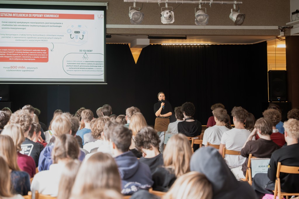 Natalia Misiuk w swoim wykładzie pt. „Cyfrowy świat: jak chronić swoją prywatność i bezpiecznie korzystać z nowych technologii” zwróciła uwagę na kluczowe zasady bezpieczeństwa w sieci. Podkreślała, jak istotne jest rozważne udostępnianie informacji w Internecie oraz świadomość, że raz opublikowane dane mogą pozostać w sieci na długo. Zachęcała uczniów do stosowania silnych haseł, włączania dodatkowych zabezpieczeń oraz ostrożności w kontaktach online. Wskazywała również, jak rozpoznawać próby wyłudzeń danych i rozpoznawać zagrożenia takie jak phishing czy deepfake oraz jak ich unikać.
